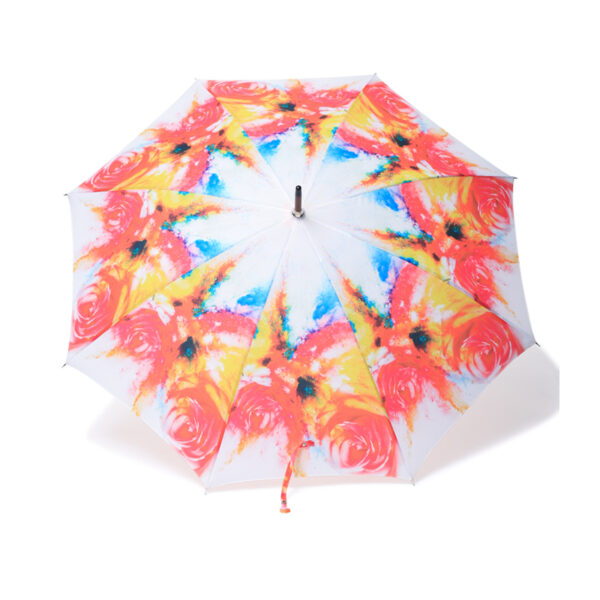 Auto open straight umbrella with wooden finish plywood Tube, wooden finish curved handle with Bosky logo engraving, black powder coated U flute ribs, design printed fabric with same print cloth case.