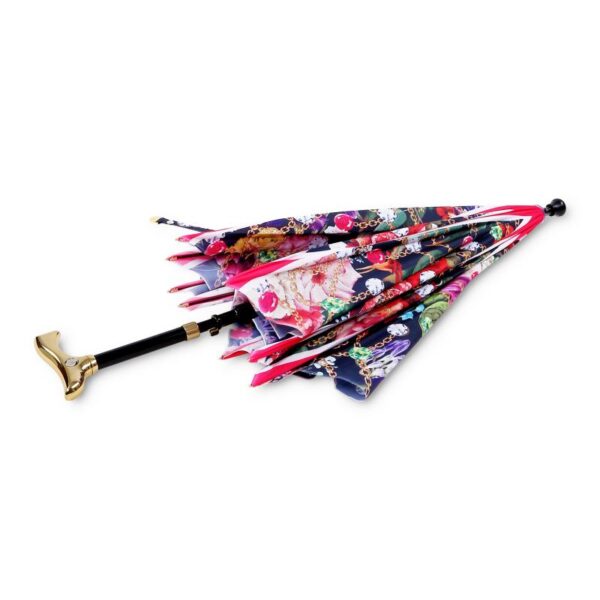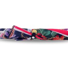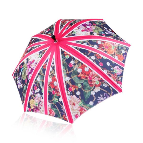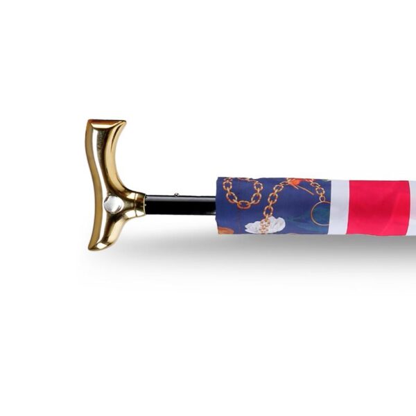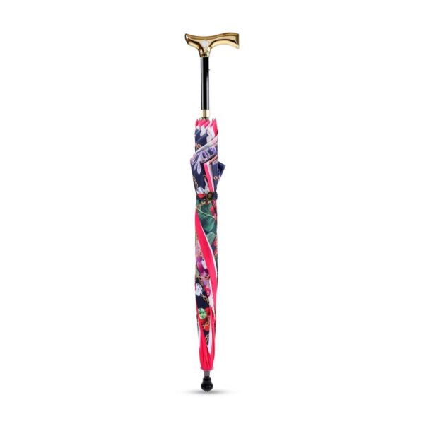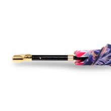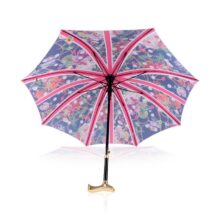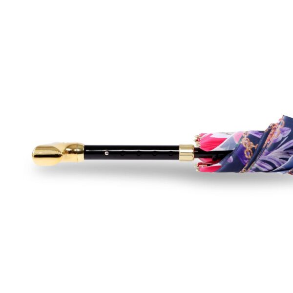 Auto open straight umbrella with black powder-coated Alu tube, height-adjustable L shape handle with gold finish, FRP 8 ribs, gripper bush on top, printed fabric with same print cloth case.