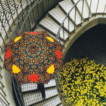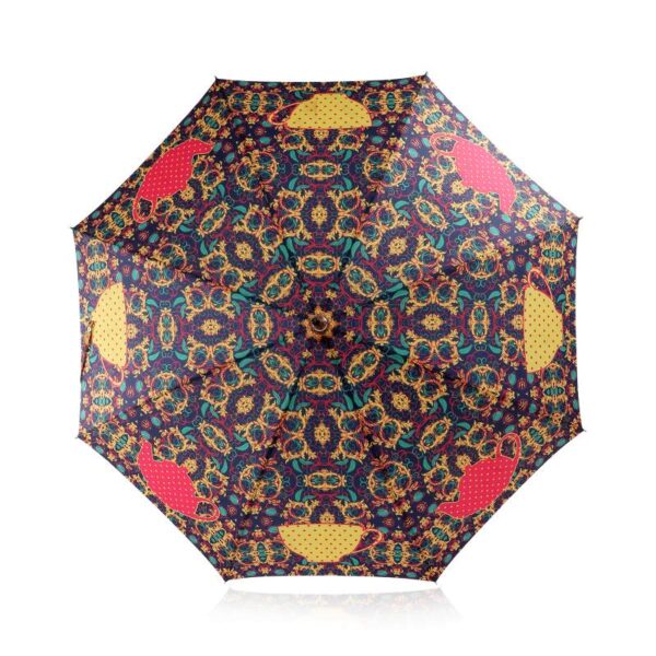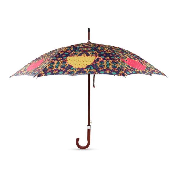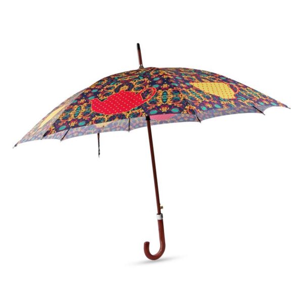 Auto open straight umbrella with black colour Tube, matching color curved plastic Handle without name, black color ribs, design printed fabric with plain plastic case.