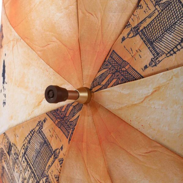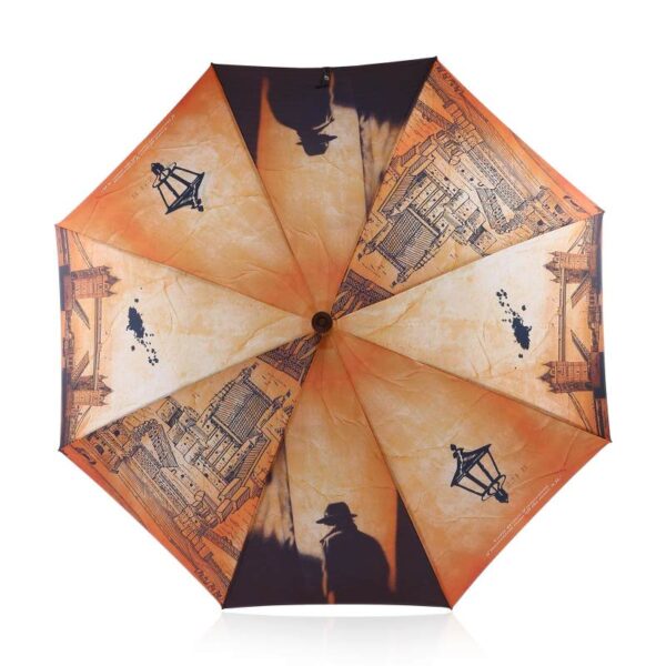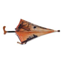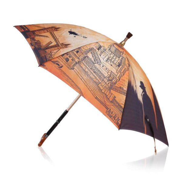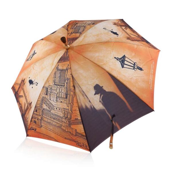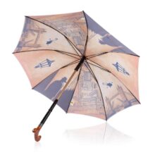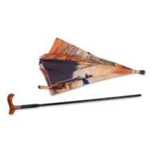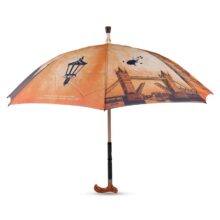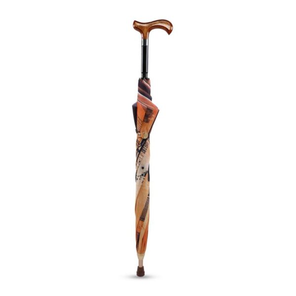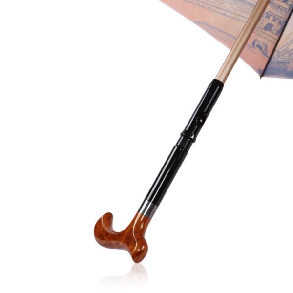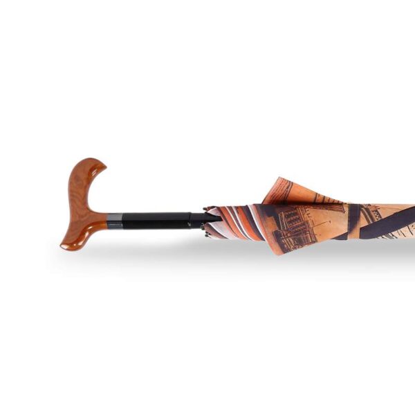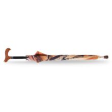 Manual open straight umbrella with alu shaft and an inner inserted walking stick fitted handle, Black color spring pull ribs, design printed fabric and cloth case.
