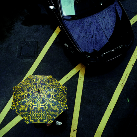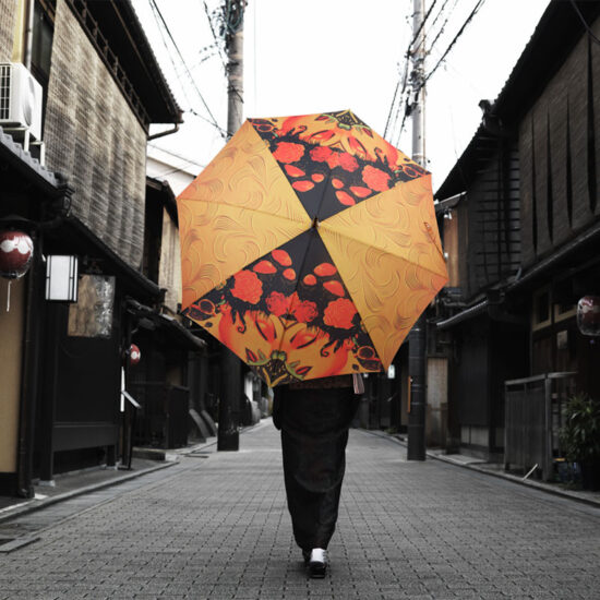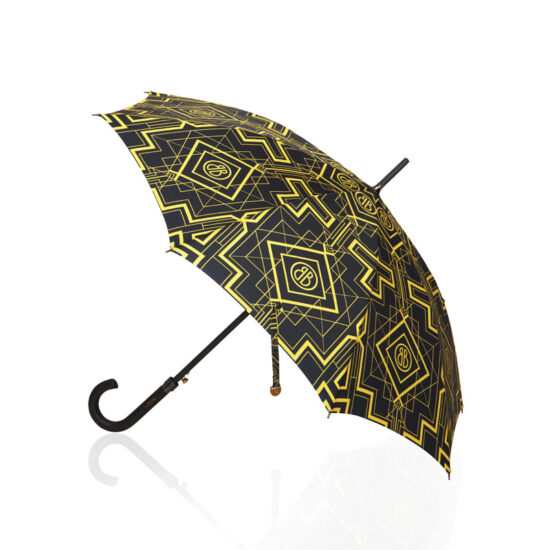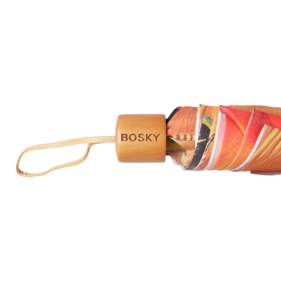 Straight open umbrella with silver-mat finish Alu tube, Alu-FRP ribs, Bosky logo engraved wooden handle and design printed fabric& cloth case.